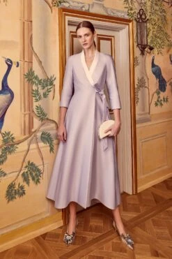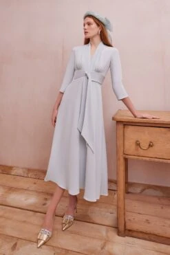 Style with our Aimee dress in azure blue wool crepe for a sophisticated formal outfit.