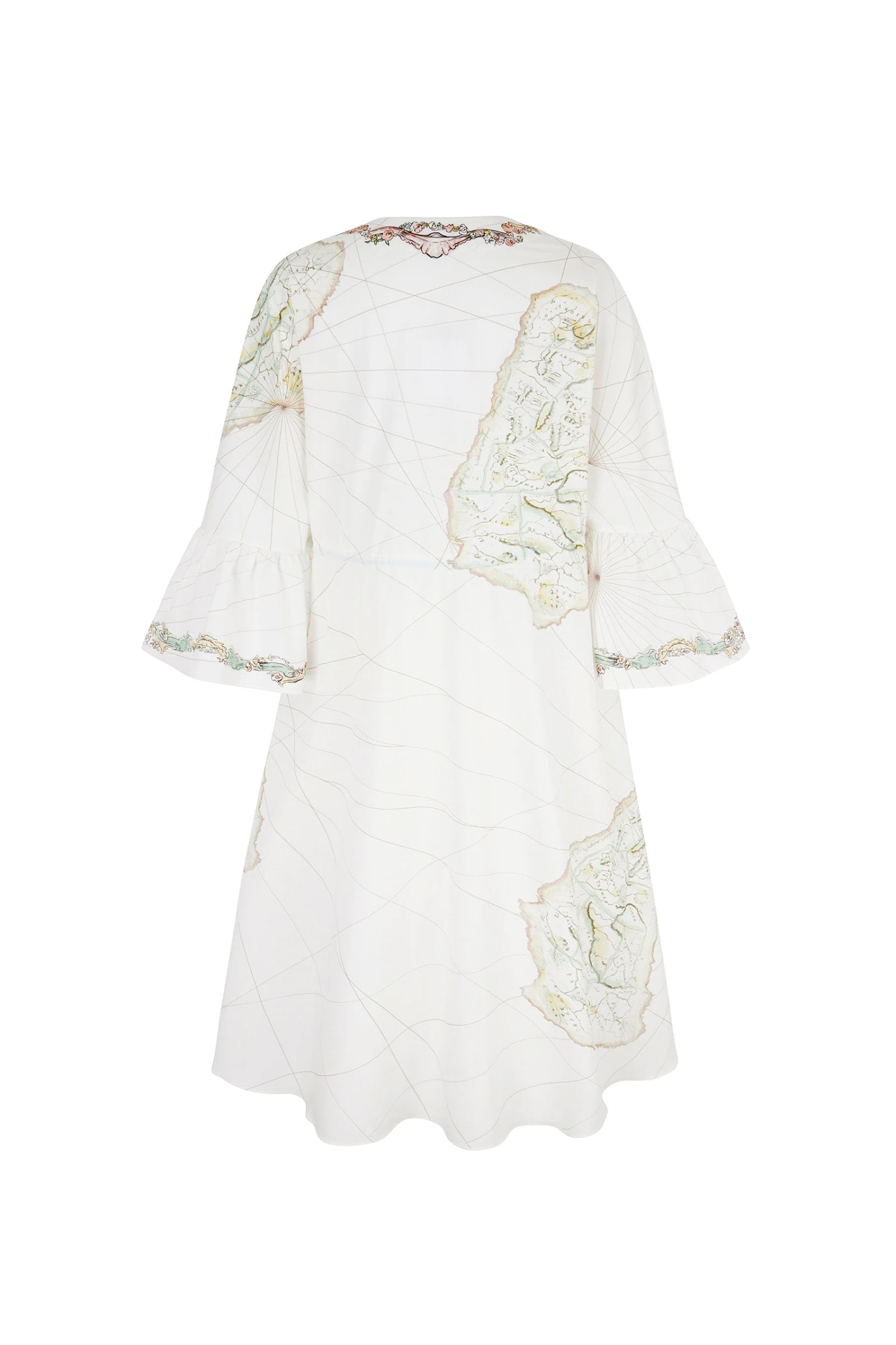 A super pretty, below the knee, sustainable white based Italian organic cotton printed kaftan dress perfect for beautiful holidays on deck and on shore.