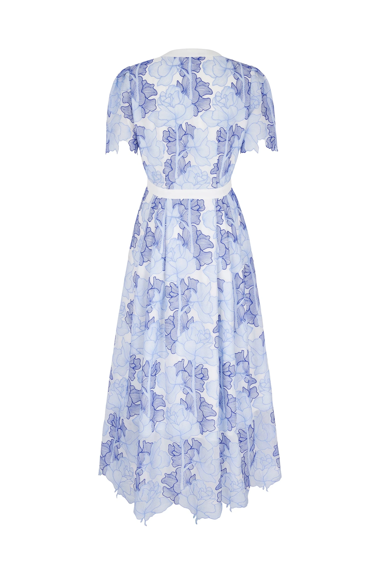 The dress has a body skimming fit and flare silhouette, which is finished with the prettiest of fine scalloped edges at the sleeve and skirt hems, showcasing the beautiful detail of this premium embroidered cloth.