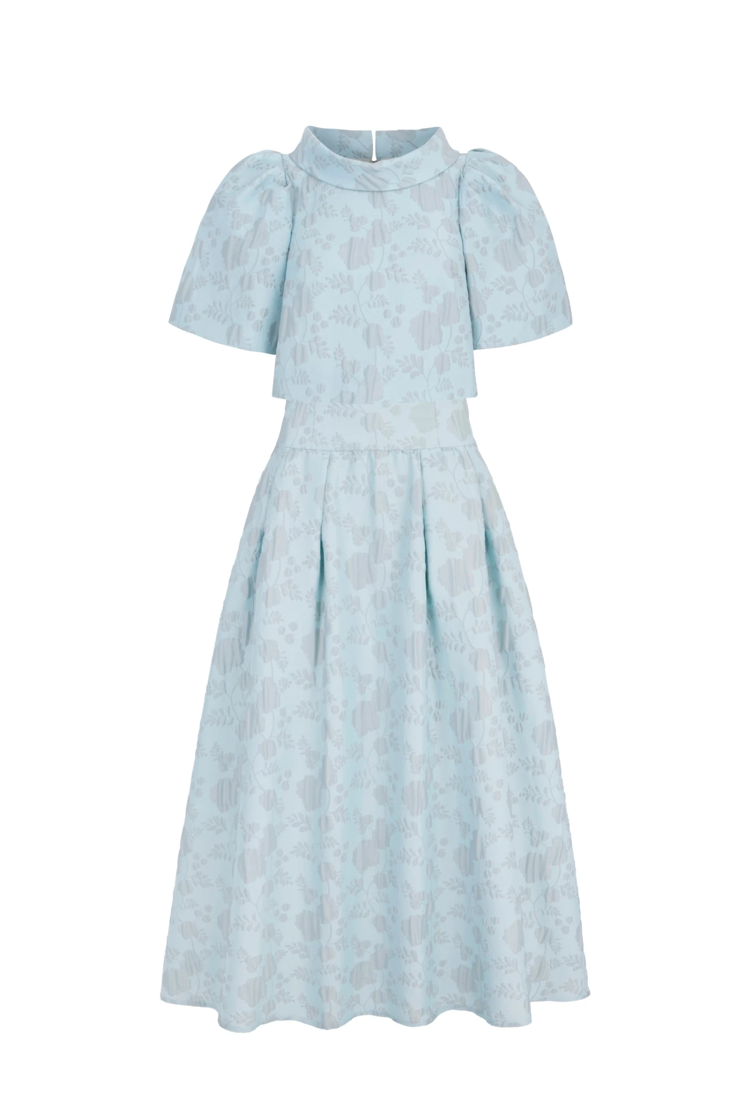 The divine fit and flare super flattering skirt is fully lined in silk. The skirt is a graceful mid length. The softly-structured bodice finishes on the natural waistline, and features a flattering curved neckline and a beautifully exaggerated square sleeve
