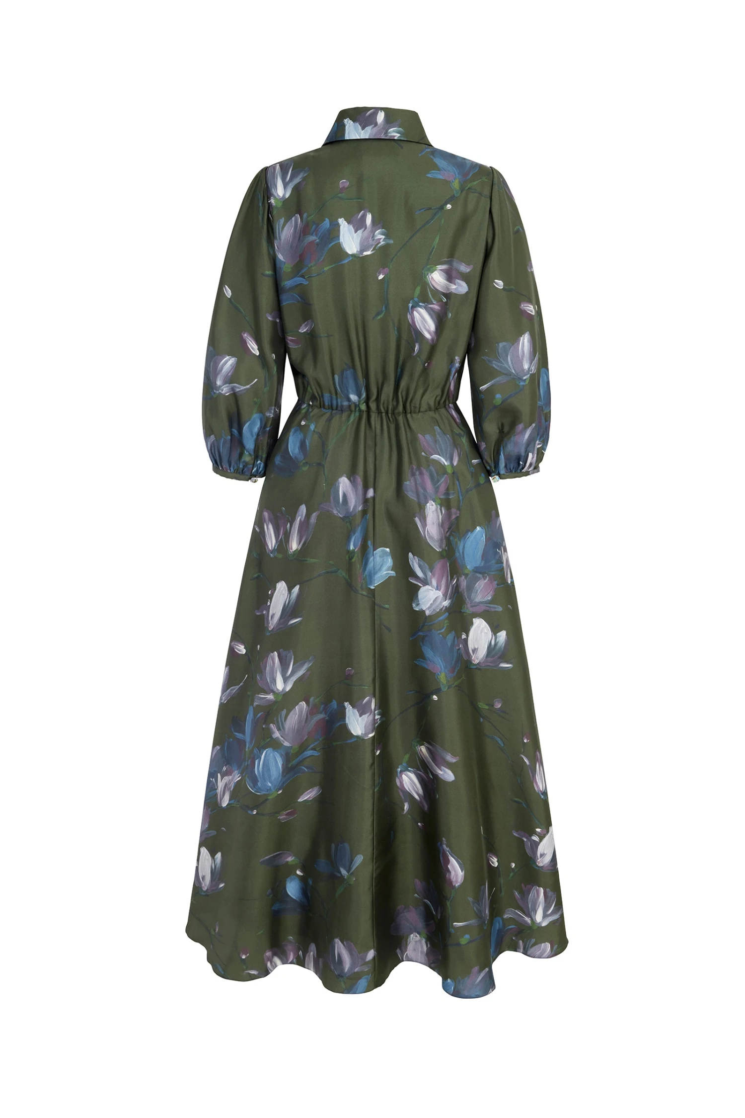 This beautiful dress is made from lightweight, Italian silk twill, printed with a stunning painted blossom design. A mix of lilac, mauve, and fresh white pop beautifully on the deep forest green background.