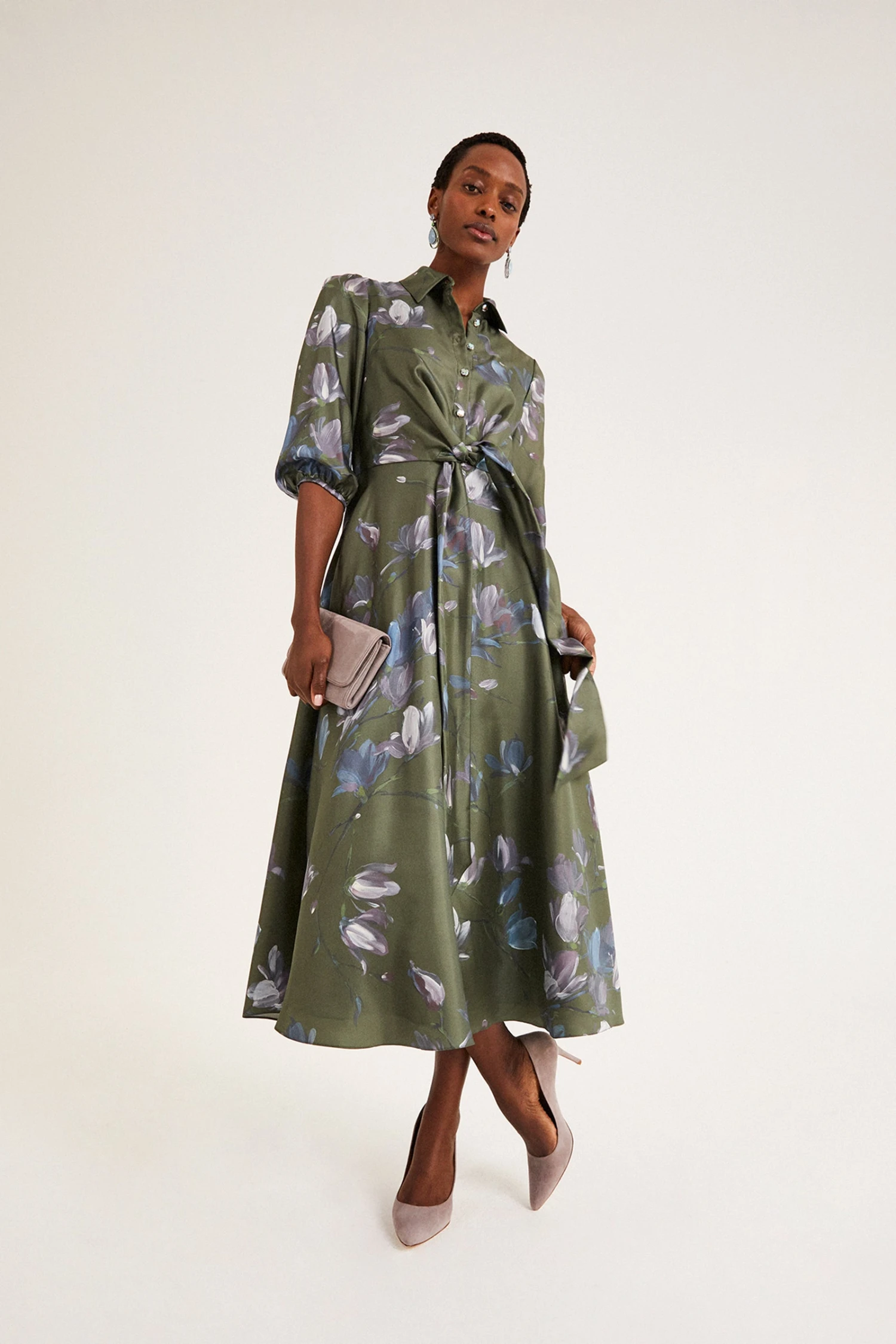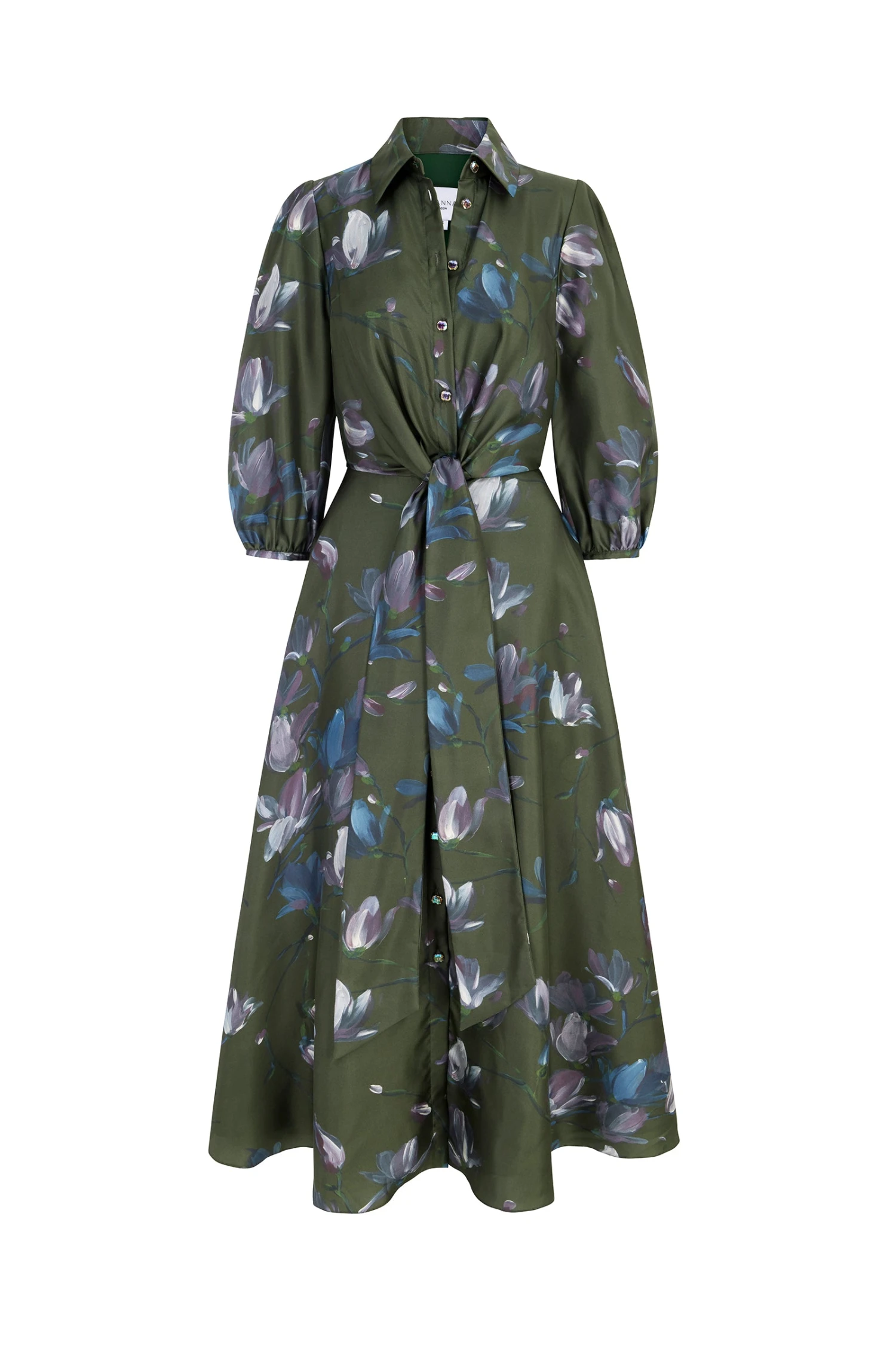 The Crawford shirt-waister dress, printed in divine soft khaki silk twill, is a stunning choice for any fun, fabulous occasion.