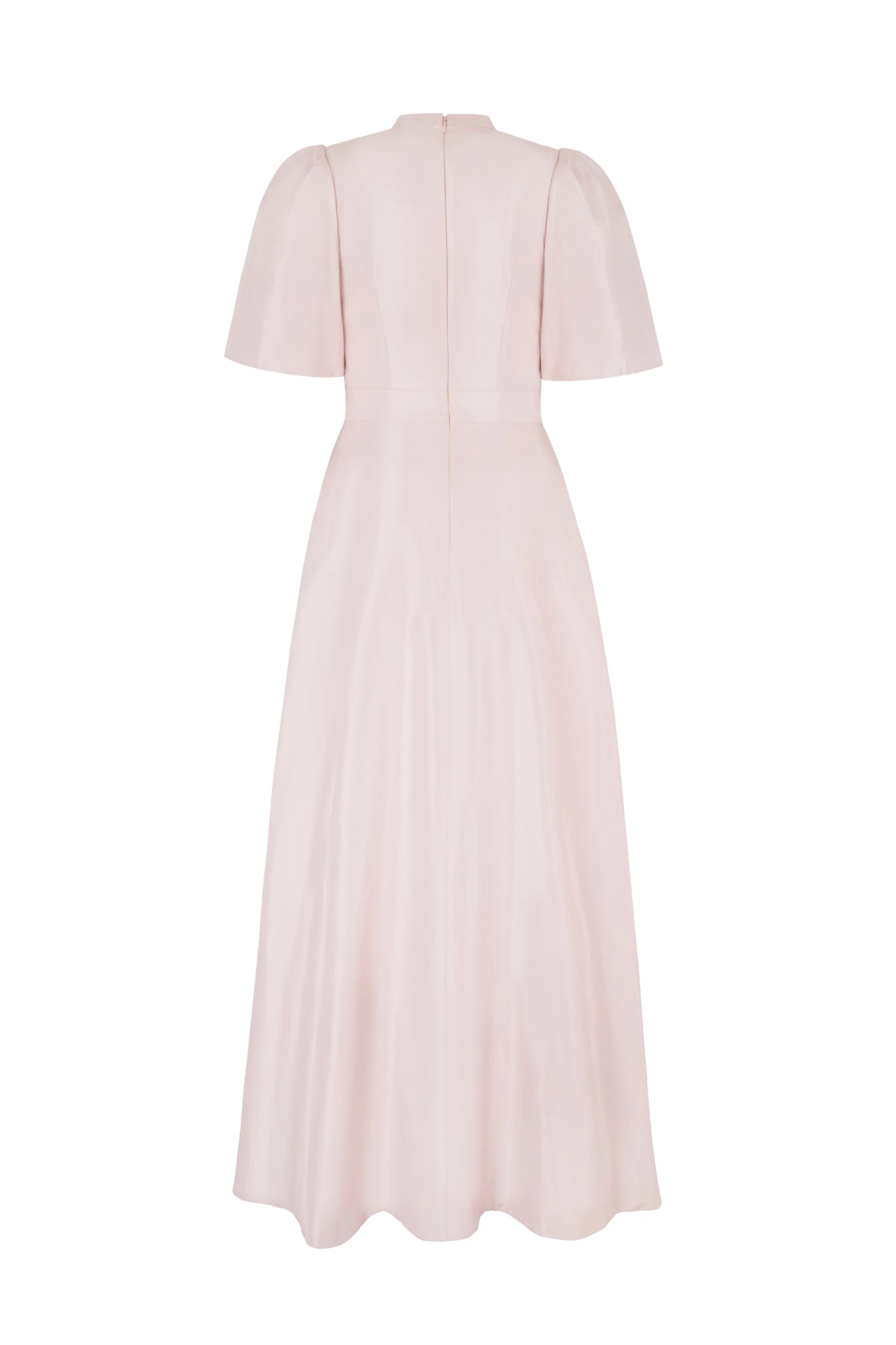 Cut from a lightweight blush taffeta cloth, Delphine has a timeless silhouette that creates impact with immaculate precision cutting and modern proportions. With a beautiful tulip shaped wrap skirt that is fixed at the waist, the side and back skirt fall to gown length. Pockets feature in the side seams of the skirt, and the fitted tailored bodice is finished with a round neck and subtle V, with softly sculpted sleeves that are cut to finish above the elbow.