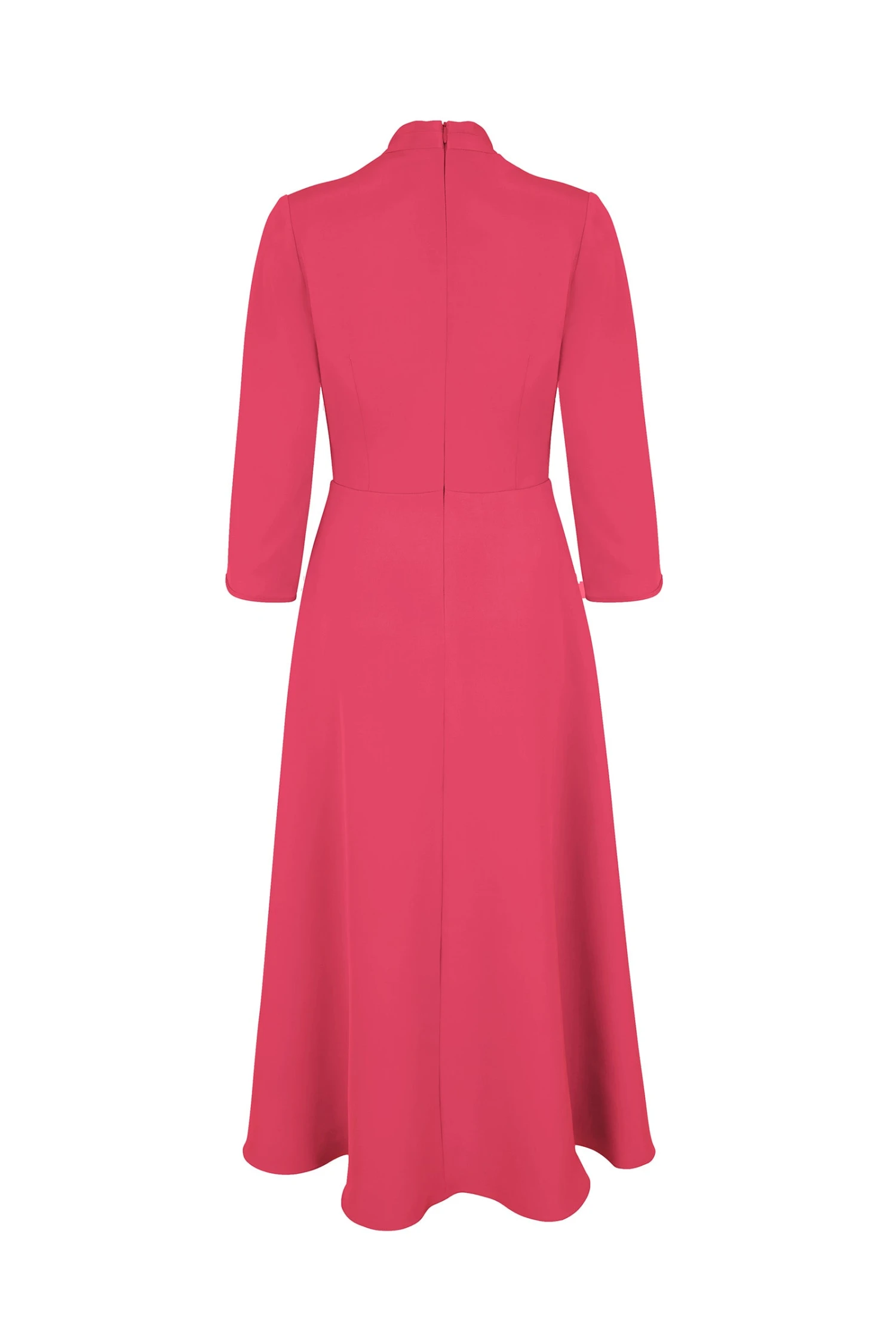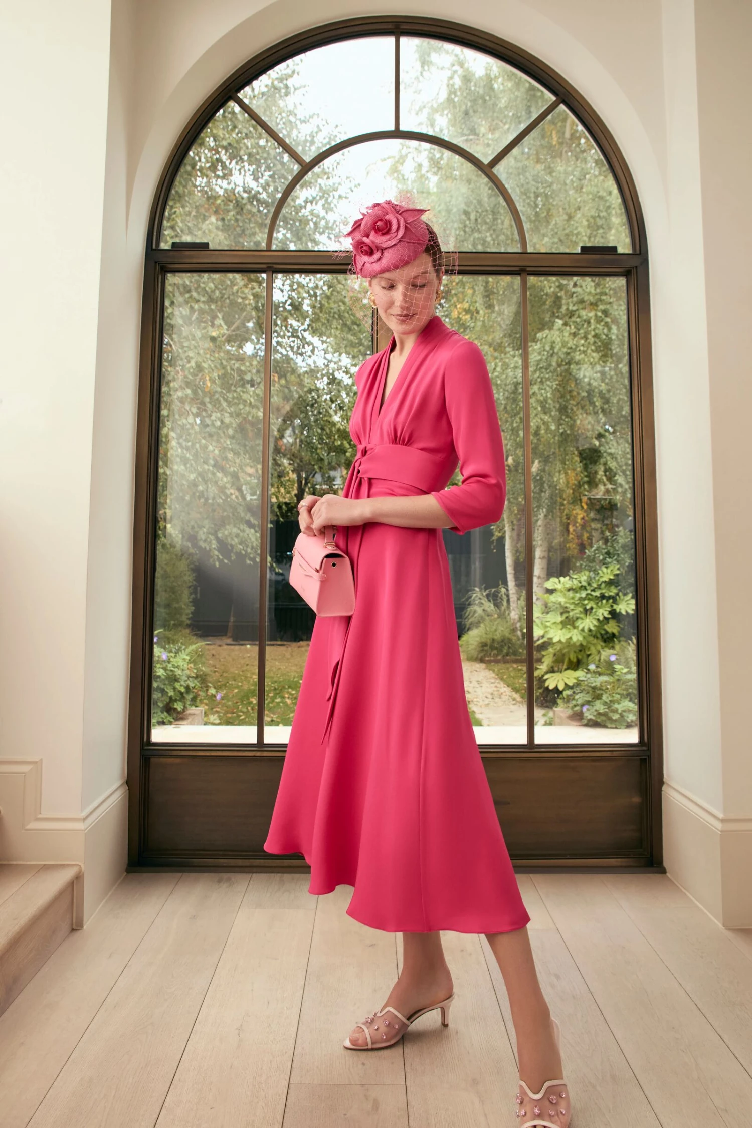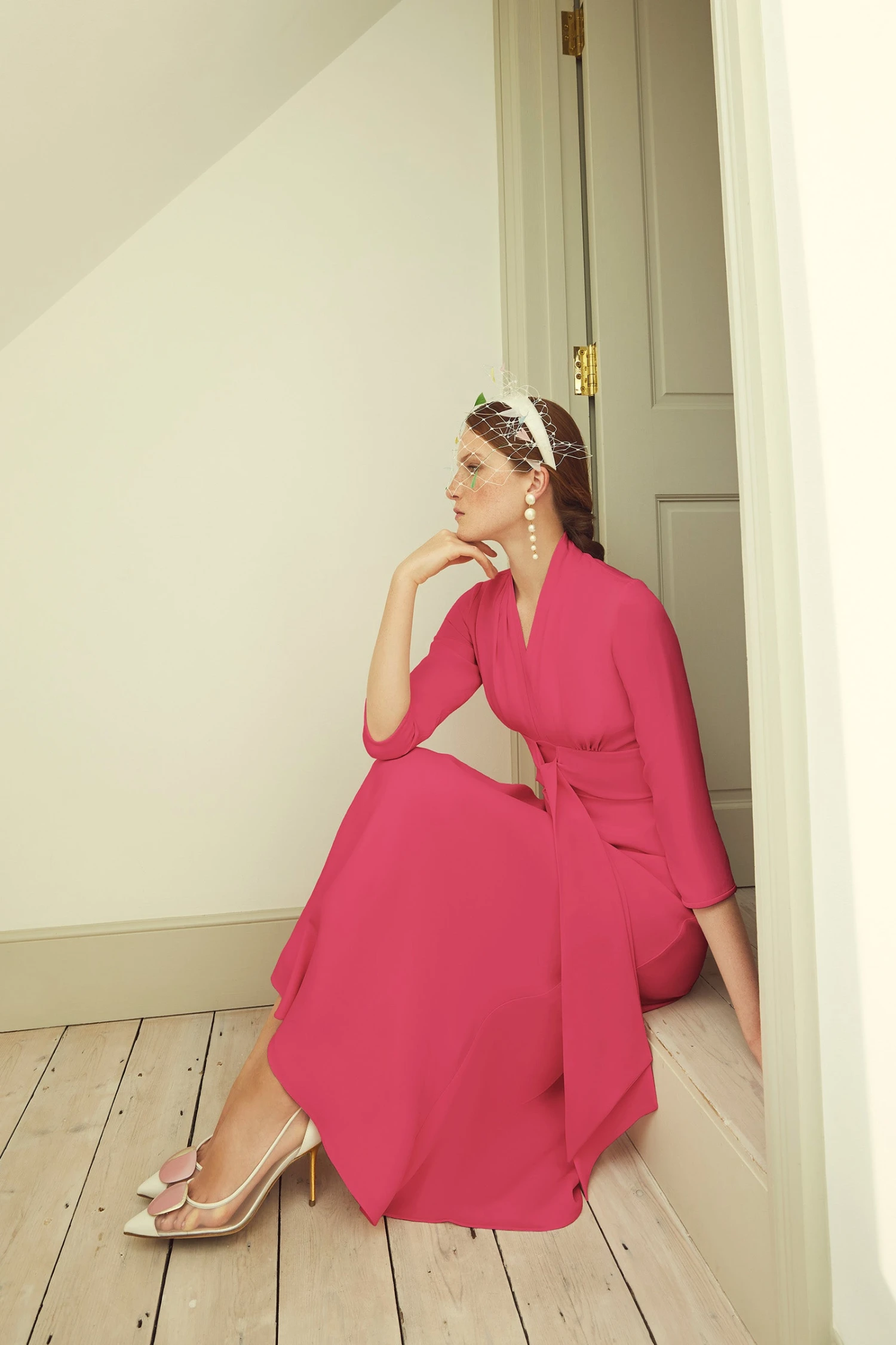 Made from our signature, fluid Italian silk crepe in a stunning Raspberry shade. With its narrow, elongated v-neckline, this dress elegantly frames the face while remaining demure enough for every occasion.
