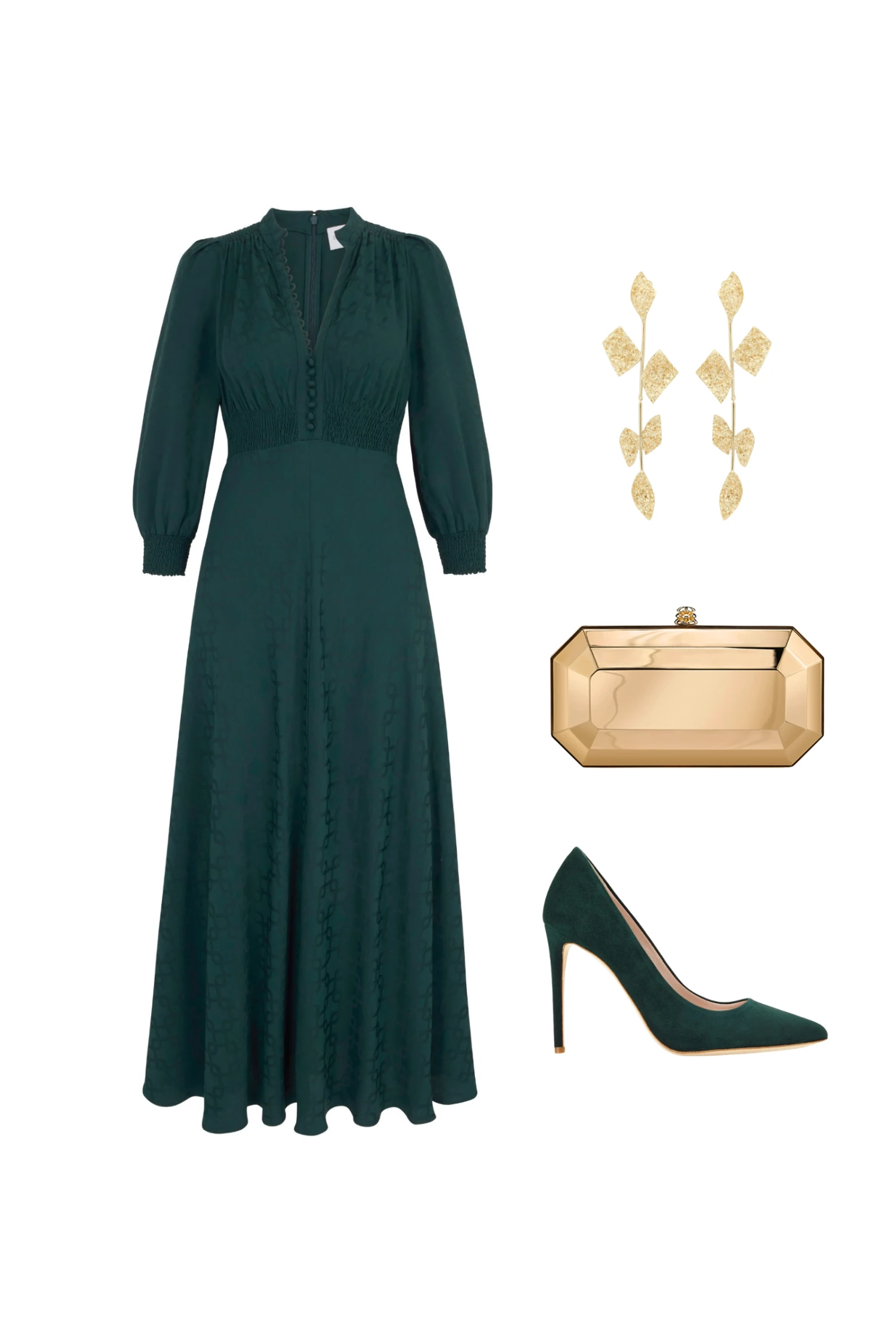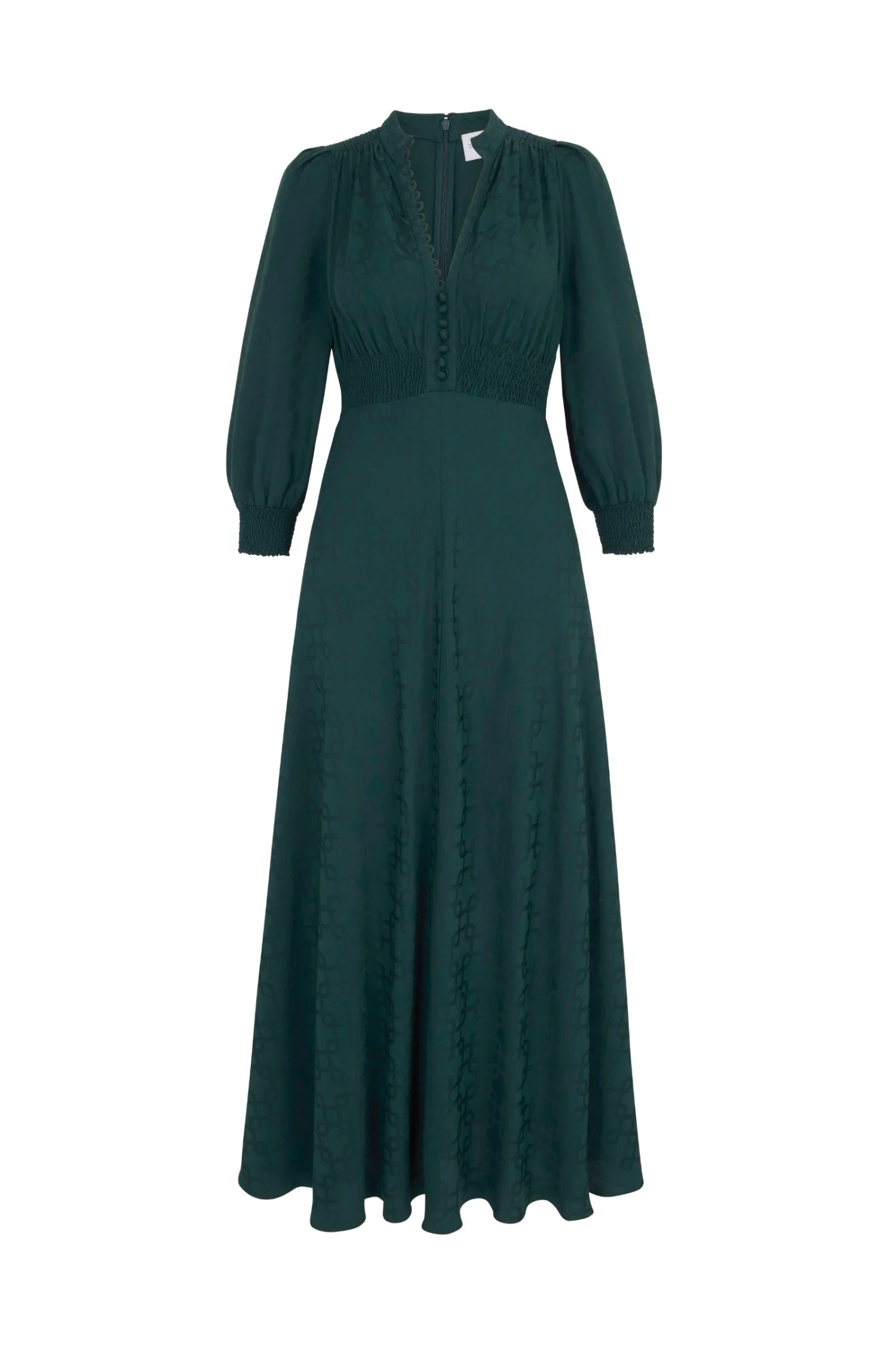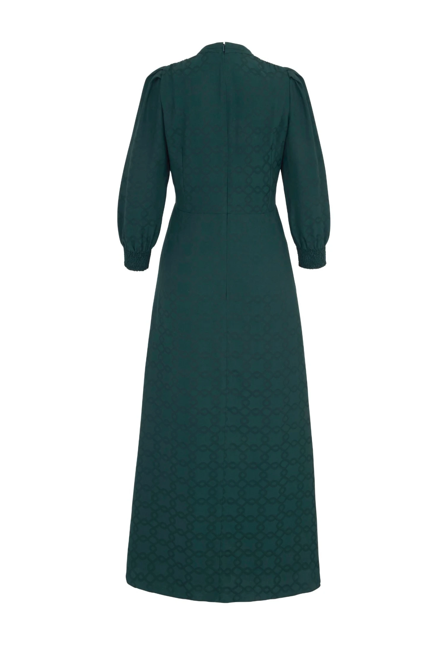 Gabriella is a soft, feminine, and super flattering 1930s-inspired tea length dress in a beautiful Italian jacquard. The dress is a beautiful luxury viscose with a divine geometric surface texture.