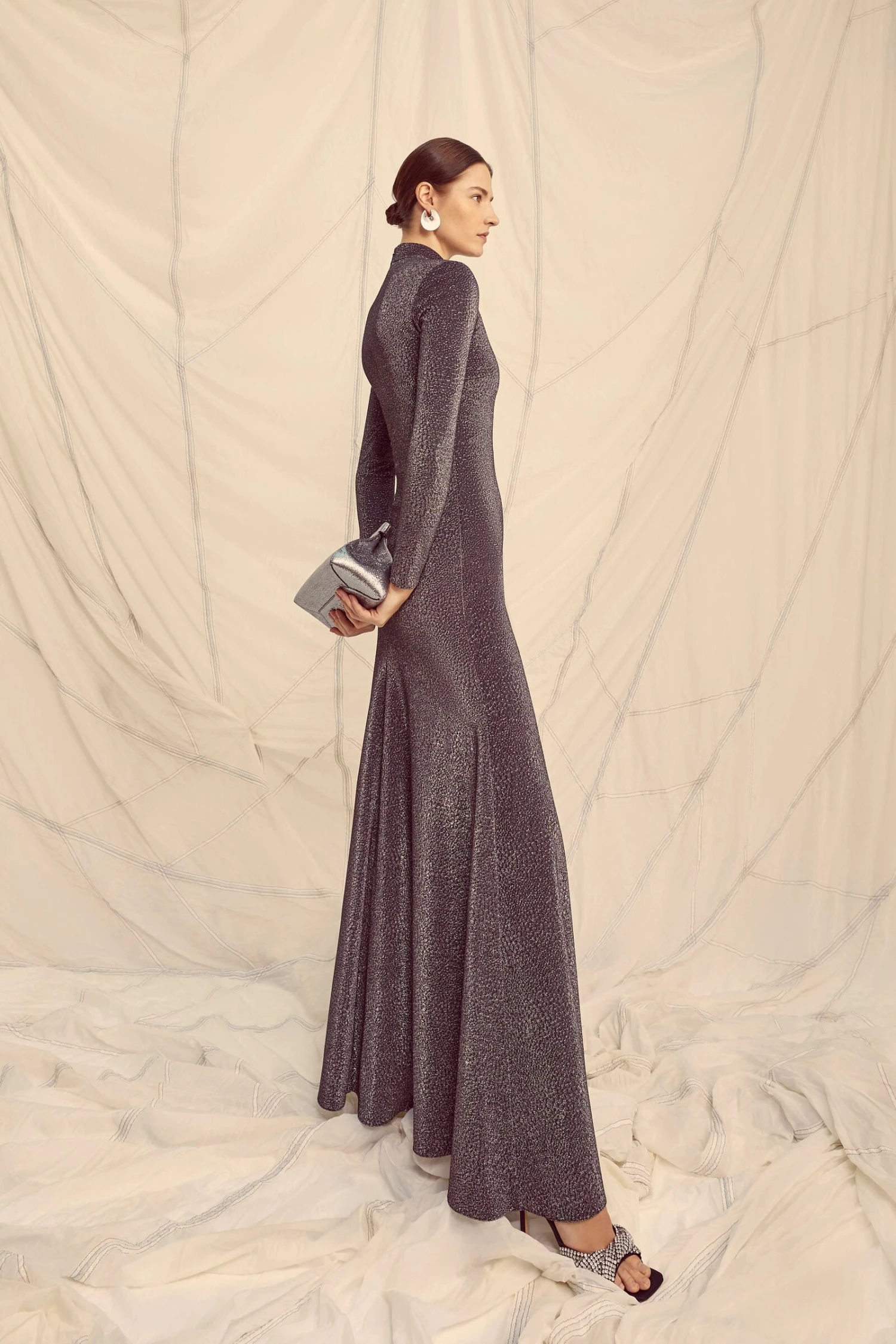 The Hemera Gown is a stunning sleek floor length gown, cut from a high quality Italian stretch smooth metallic jersey.
