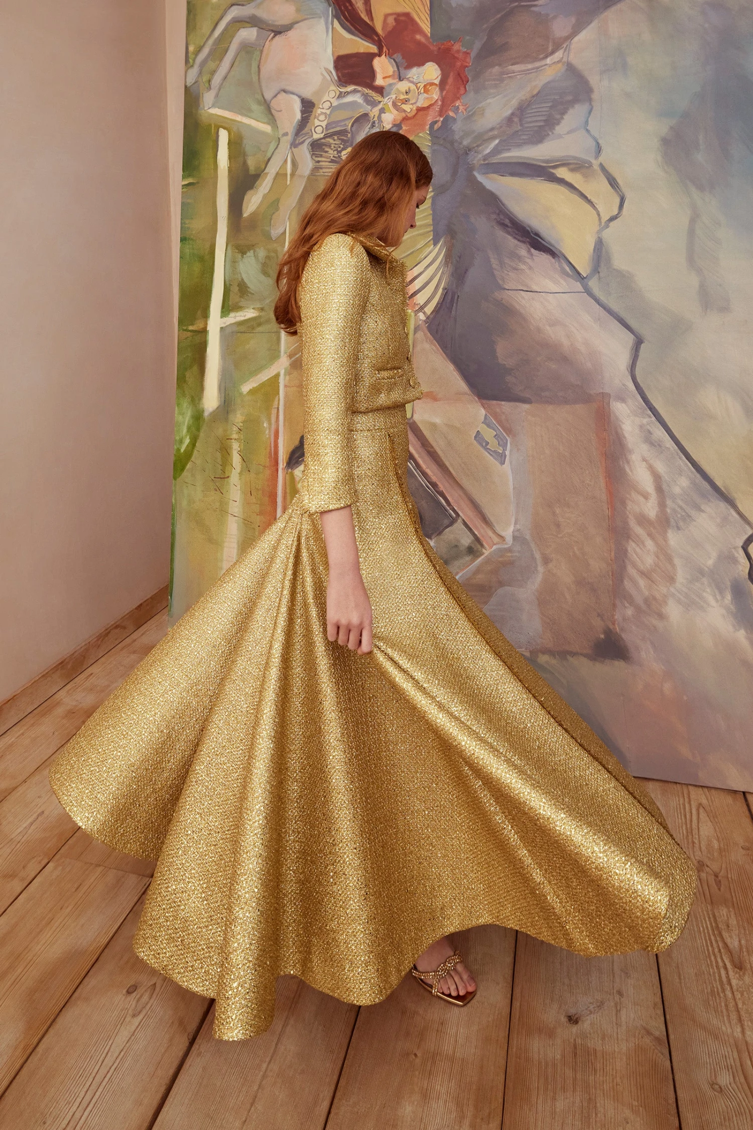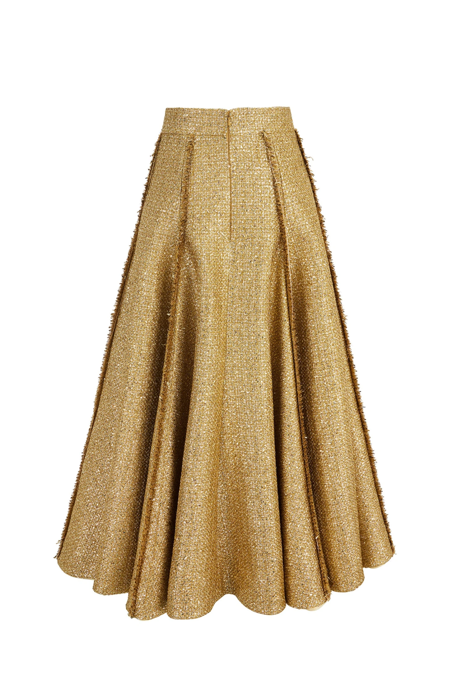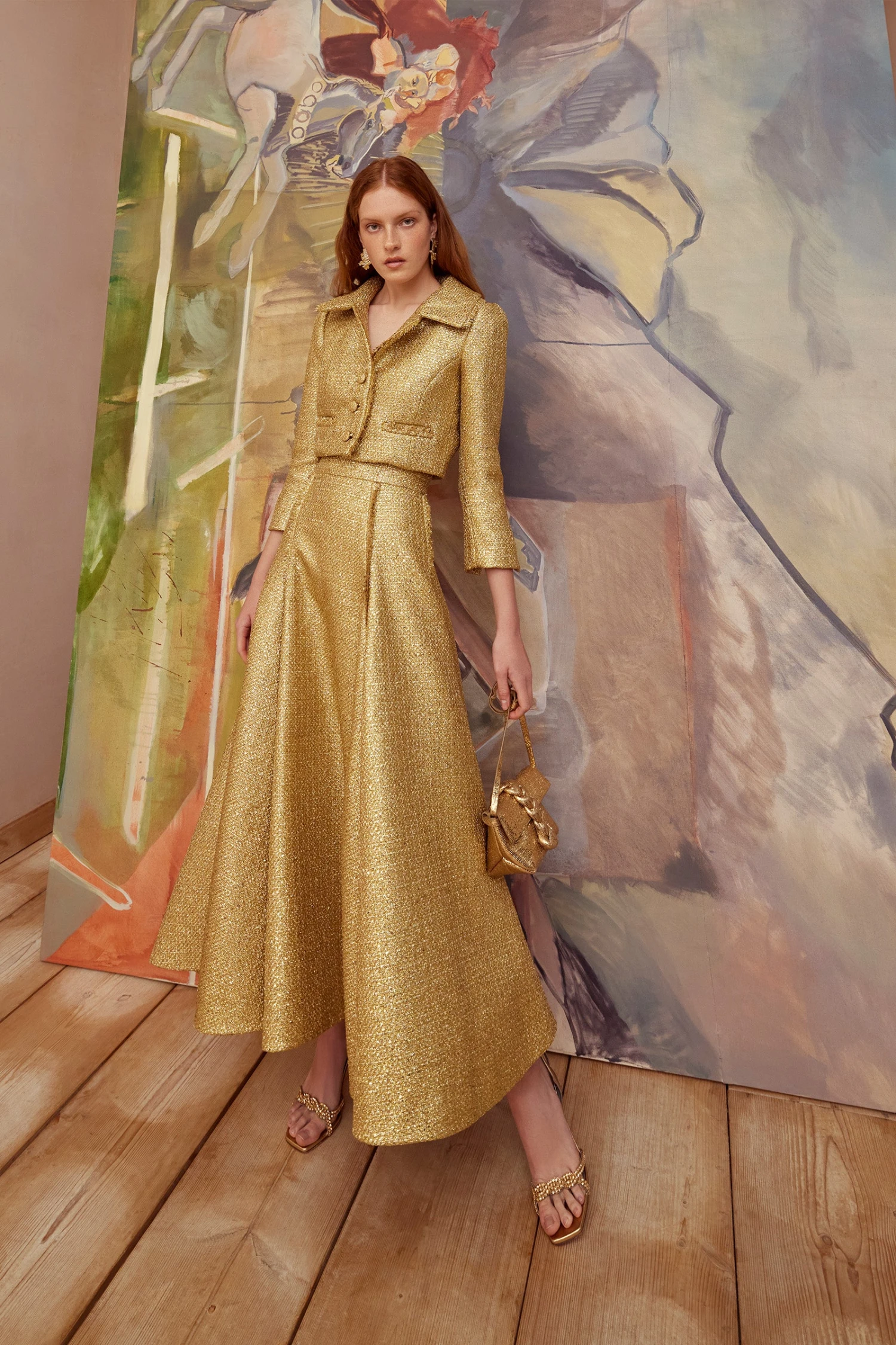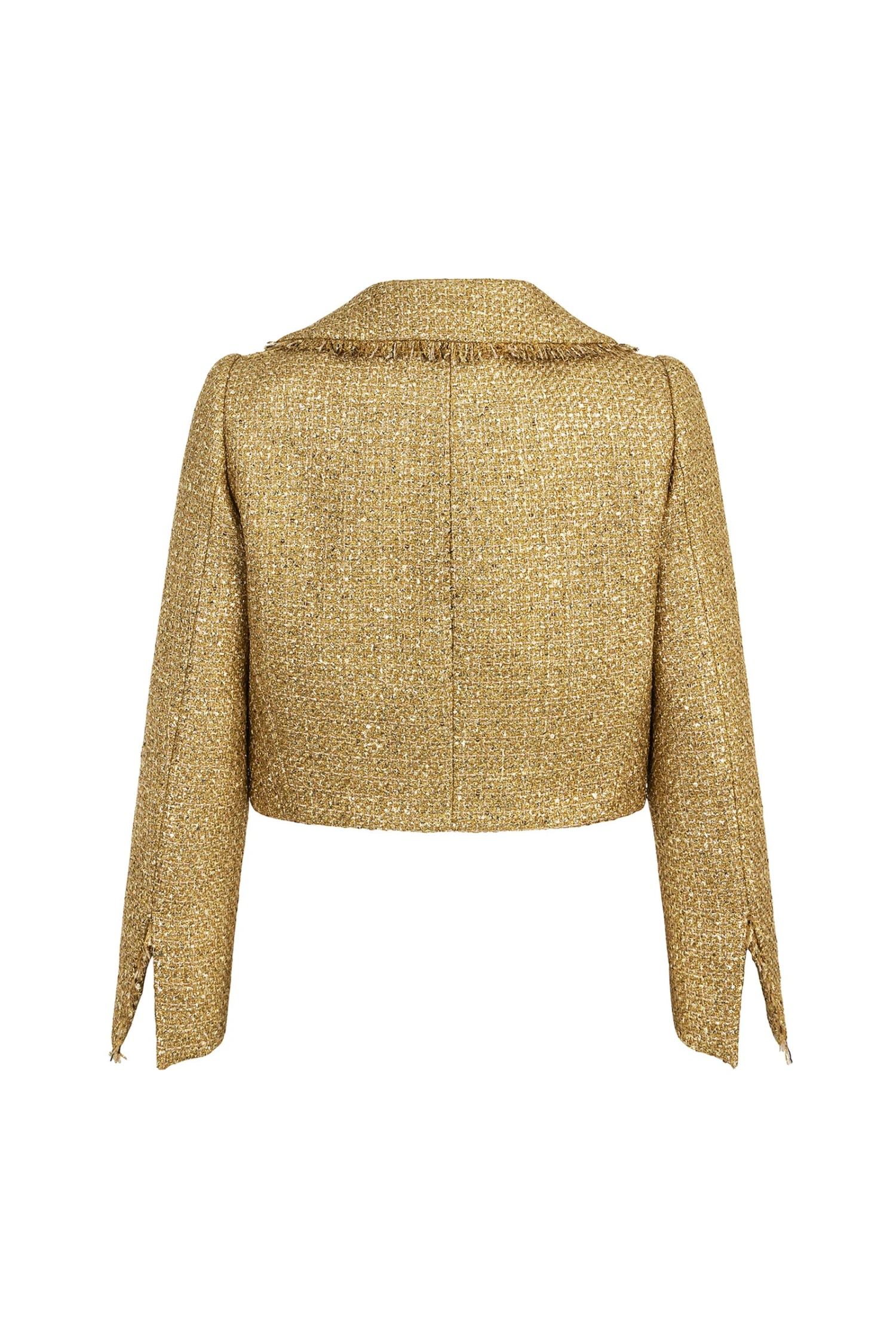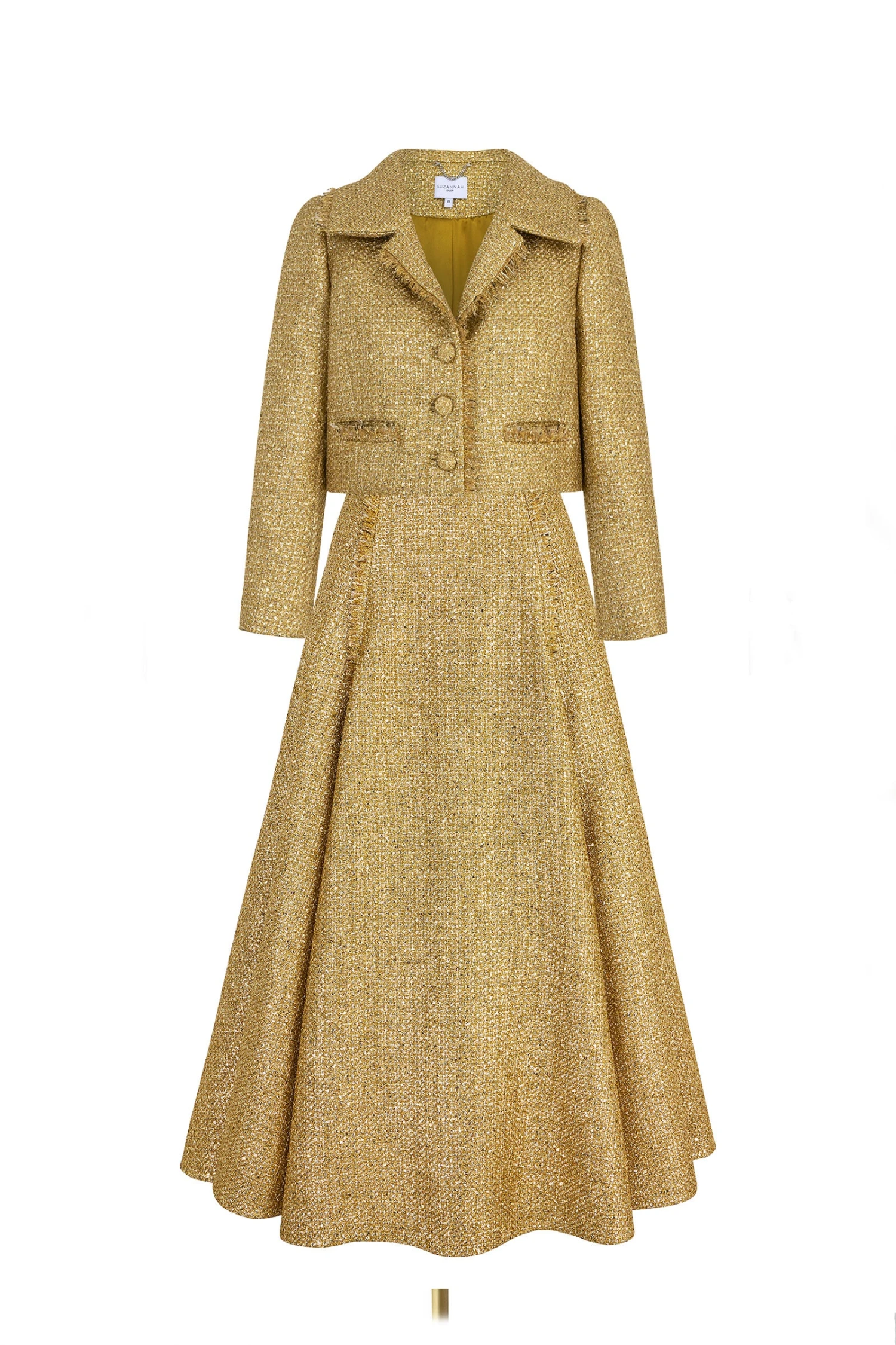 A stunning ankle length skirt with cropped jacket. This beautiful set is constructed in a sensational exclusive Italian gold metallic tweed.
