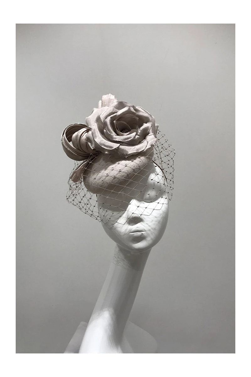 Stunning millinery by British milliner Juliette Botterill. Putty felt base, trimmed with delicate silk roses and silk abaca knot twist bow.A flattering piece which is worn slightly to the side of the head, with elastic fixing the hat and worn behind the hair at the back of the head.Beautifully crafted.