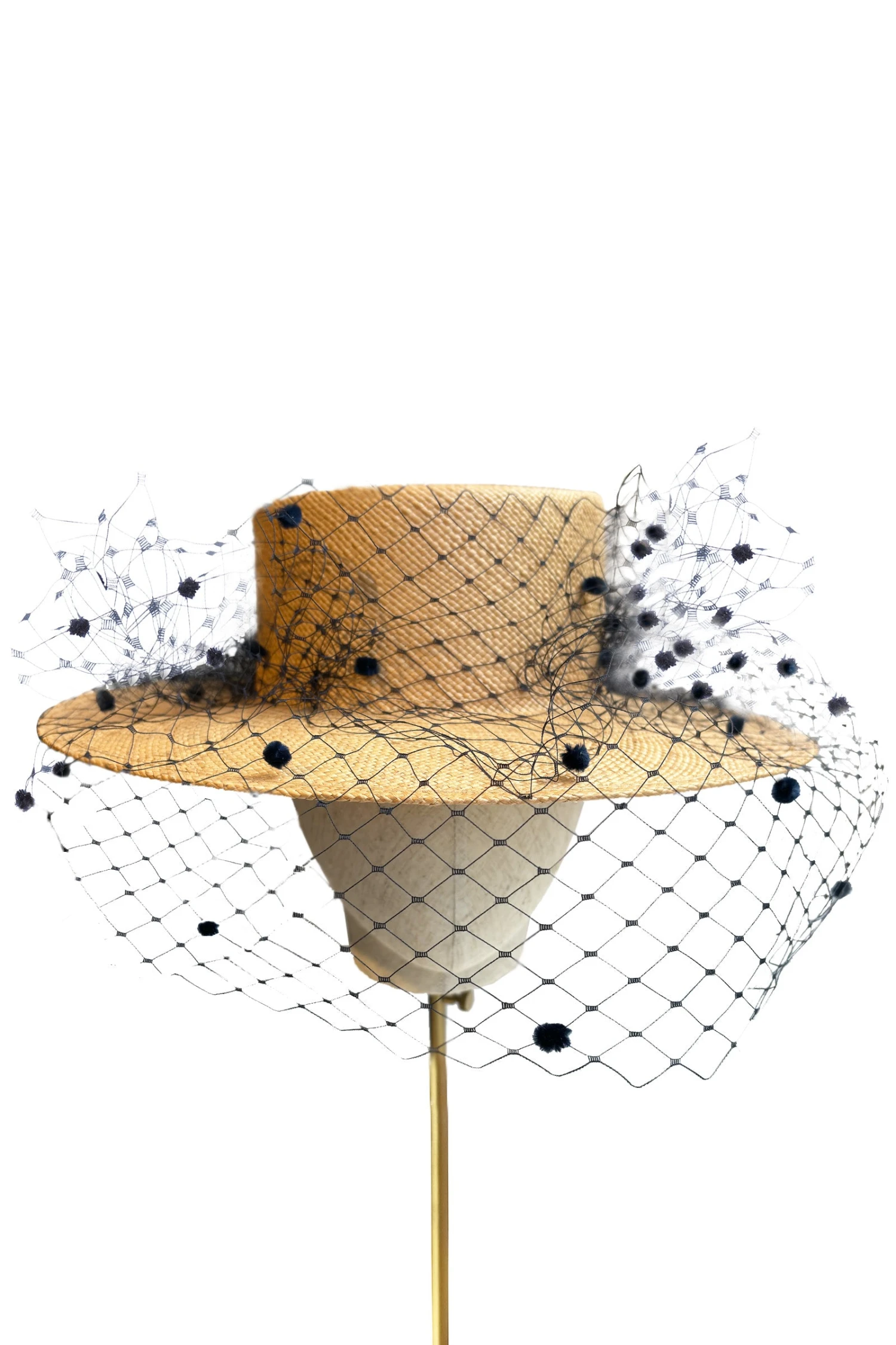 A stunning new millinery style for the season, The Nixi is a beautifully shaped ring top boater with navy spot contrast veiling, expertly crafted by prestigious British milliner Jane Taylor.