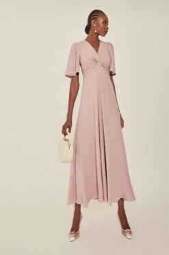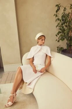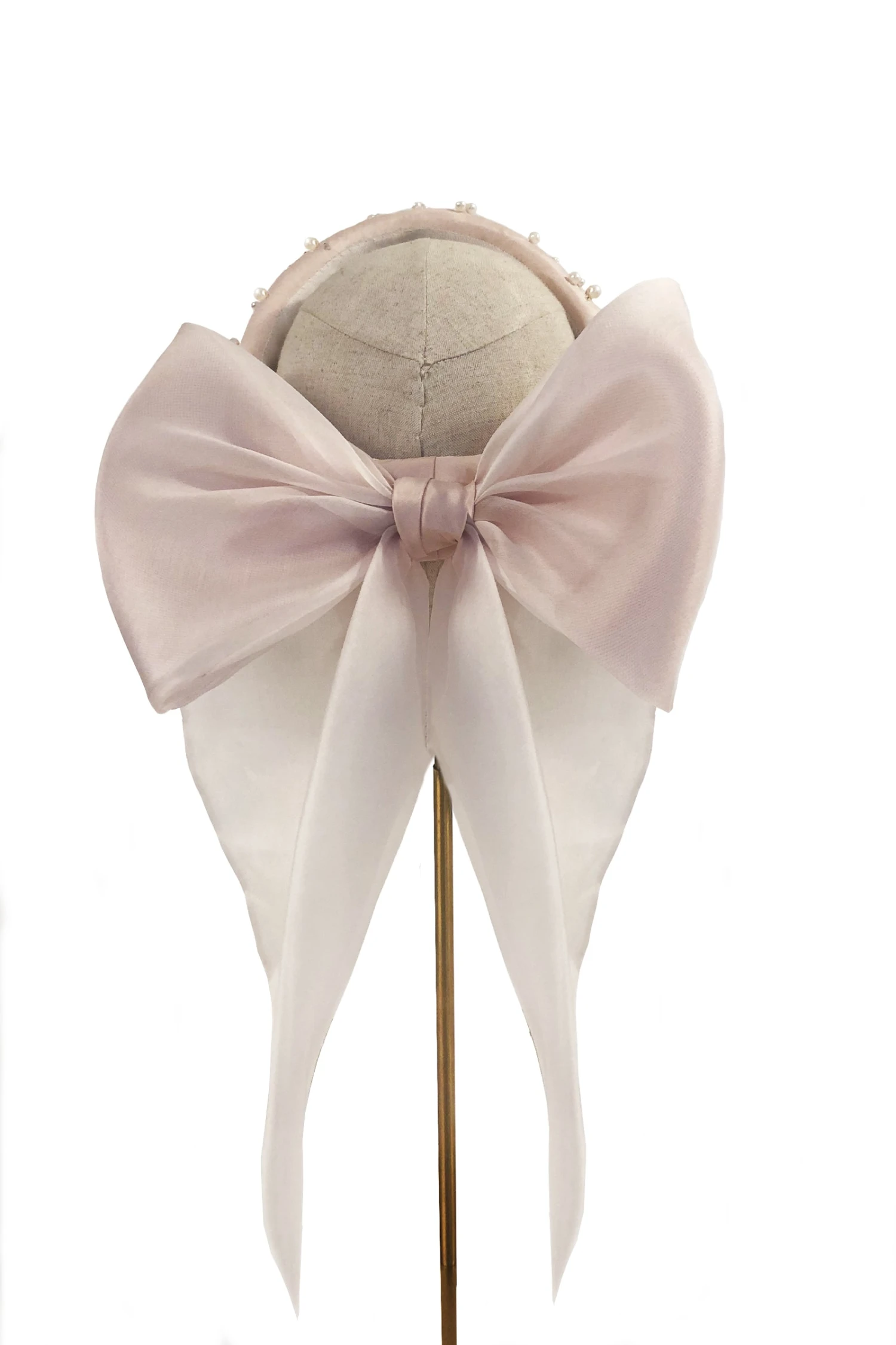 A stunning millinery collaboration between Suzannah London and John Boyd Hats, the Pearl Silk Halo is handmade using a 1930’s hat block from the John Boyd archive. The pretty and unique curved halo is covered in soft pink pure silk taffeta with hand-beaded glass pearl details and a full soft organza bow at the back.