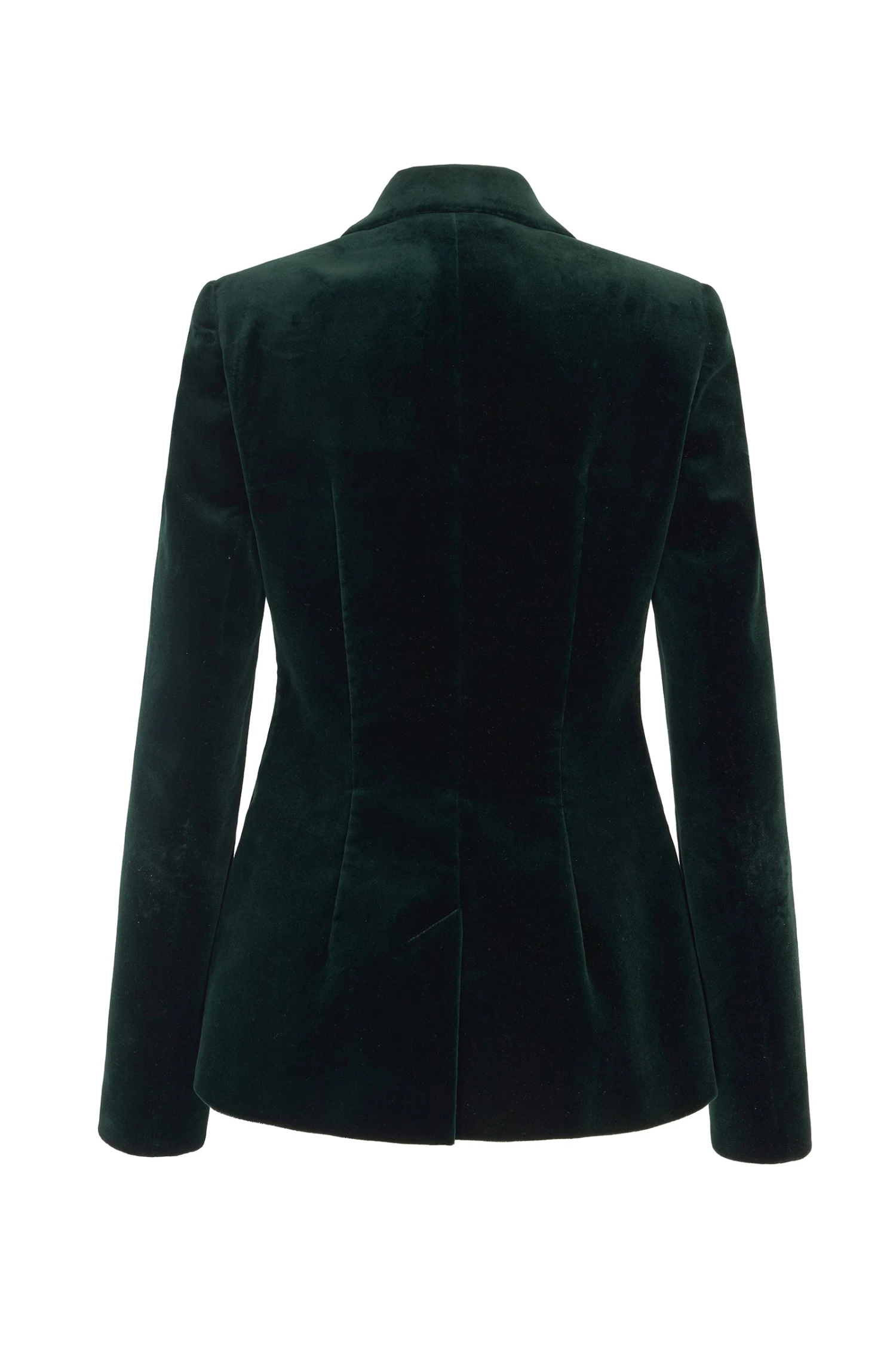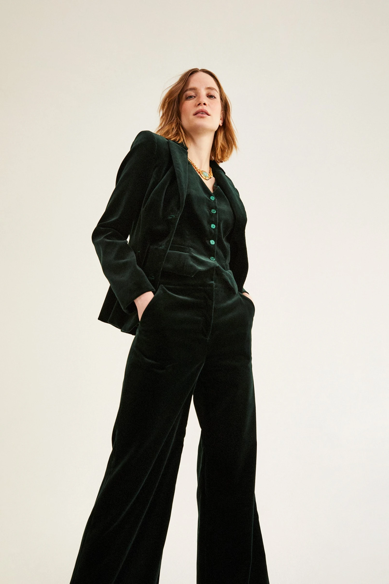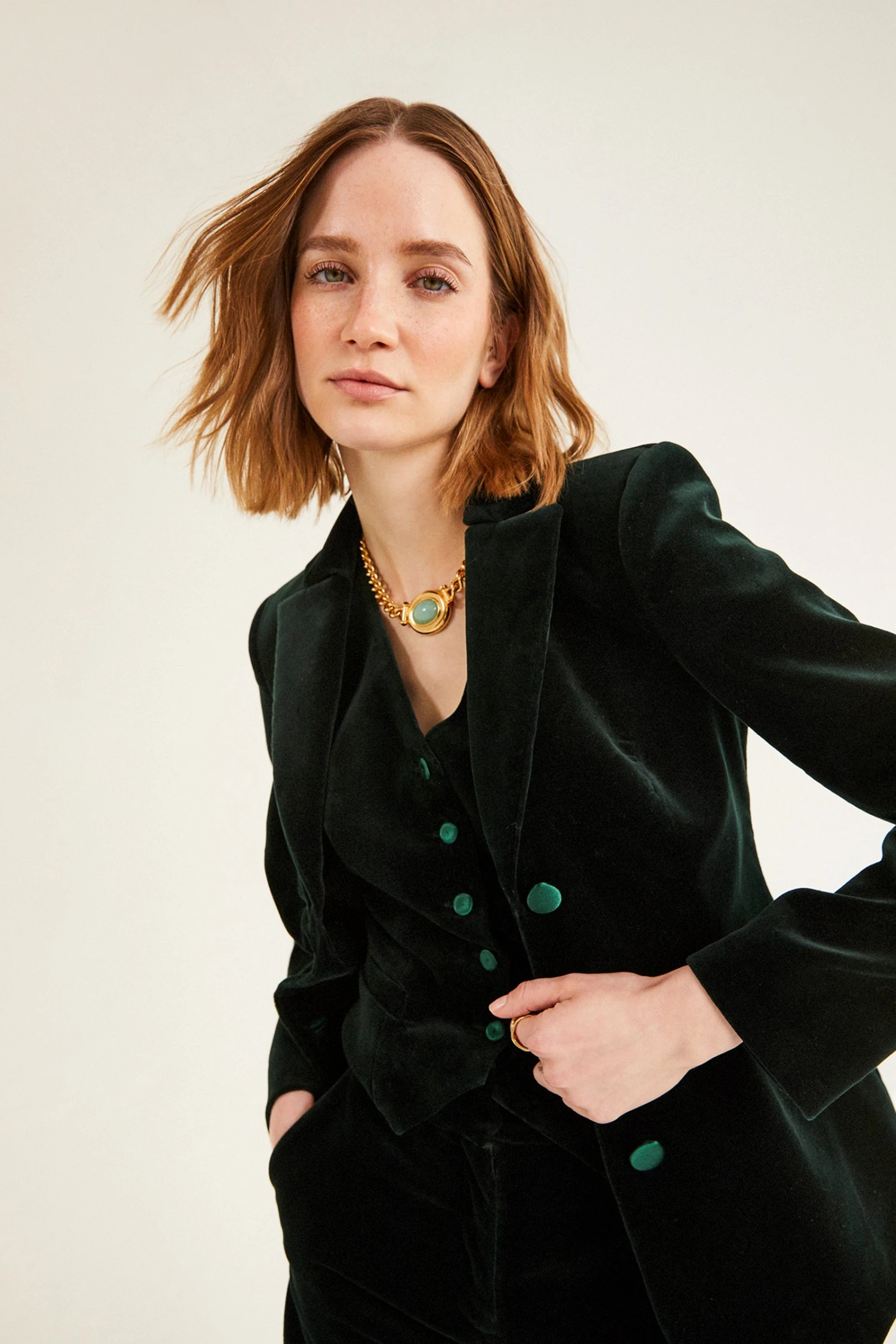 Our Queens Blazer is a beautiful single breasted blazer, cut from a rich forest green GOTS certified sustainable organic cotton velvet.