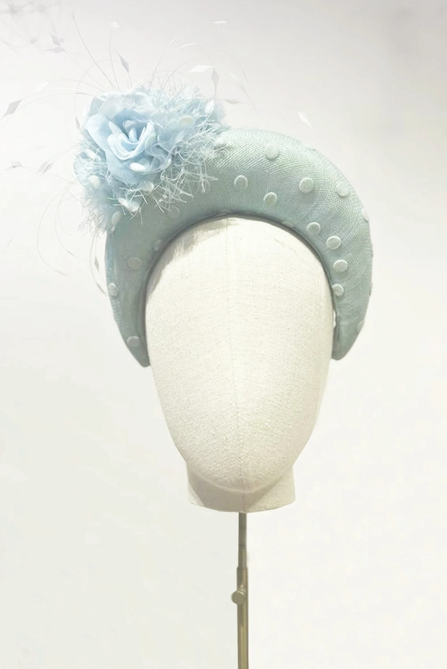 Soft sage straw structured 1950s inspired head band with a beautiful silk flower cluster spray. Delicate polka dot detailing add a beautiful finish and softness to this wonderful silhouette.