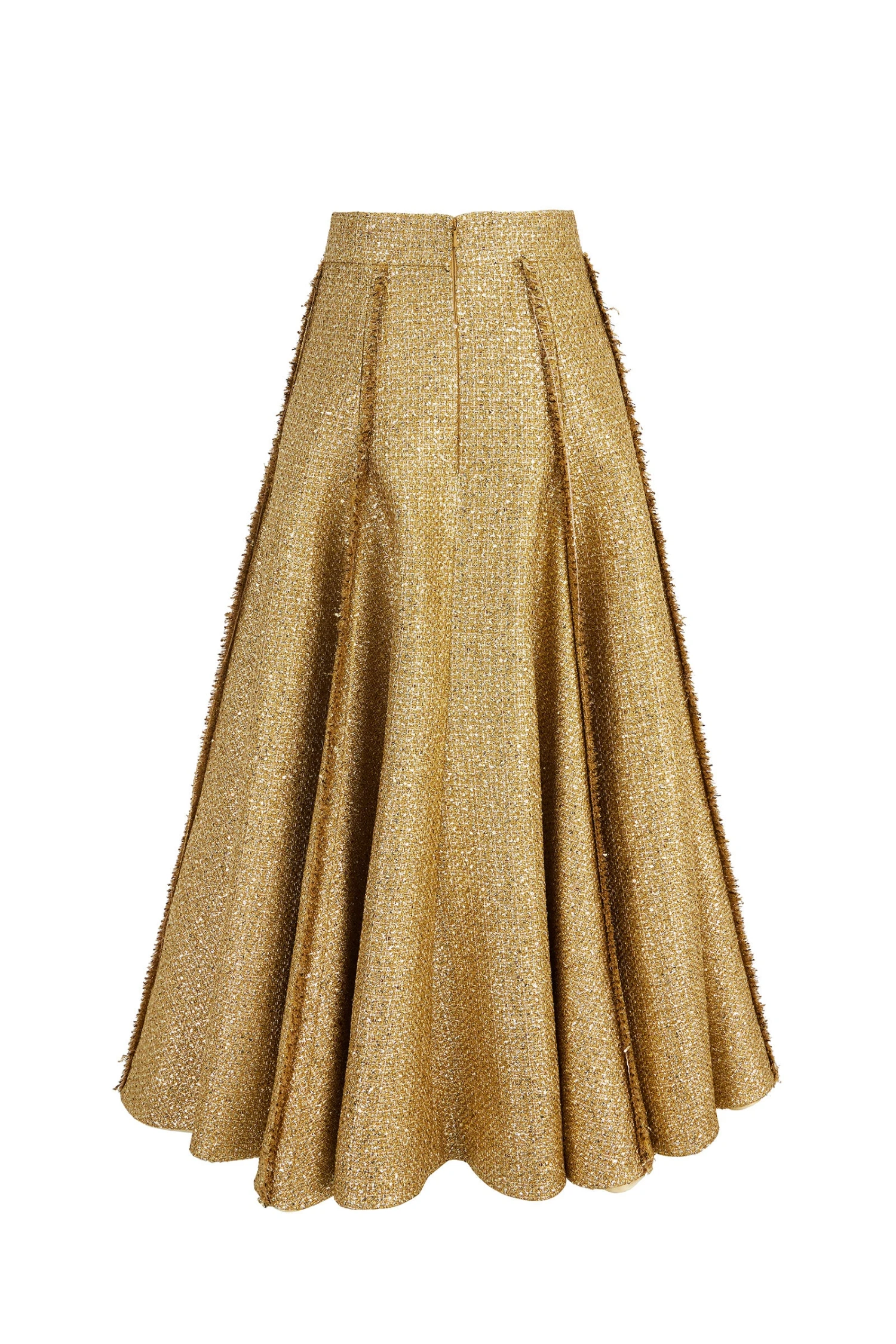 A stunning ankle length skirt, constructed in beautiful exclusive Italian gold metallic tweed. Zelda is the most divine statement skirt, creating super flattering movement in every turn.